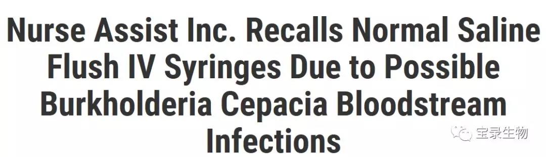 1980年,某吸入剂疑似污染洋葱伯克霍尔德菌,导致数名患者死亡,引起了美国FDA的注意,该菌已经被美国FDA列为不可接受微生物。近40年来,洋葱伯克霍尔德菌已经成为全球制药行业产品中检出率最高的不可接受微生物之一,以下是美国FDA2018年发布的I类召回,也是最严重的召回类型,使用该生理盐水静脉注射器可能会导致患者感染洋葱伯克霍尔德菌。