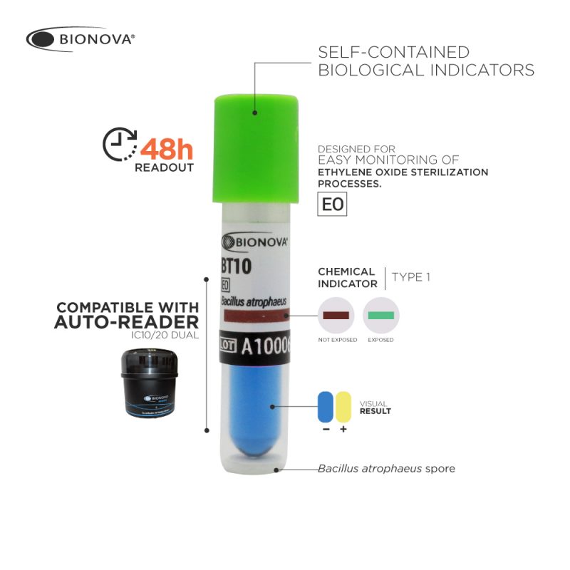 BT10 /用于环氧乙烷灭菌过程的自给式生物指示剂。 Bacillus atrophaeus (ATCC® 9372) 每瓶 10^6 个孢子。 读数:48 小时。