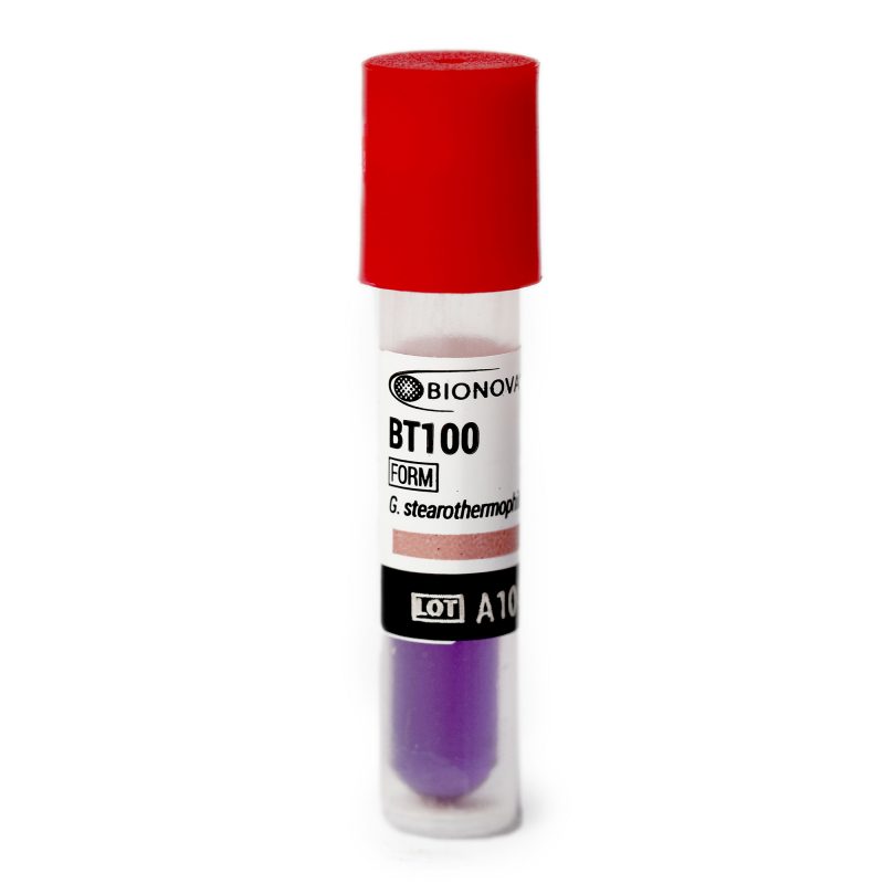 用于甲醛灭菌过程监测的自含式生物指示剂。 Geobacillus stearothermophilus (ATCC® 7953) 每瓶 10^5 或 10^6 孢子。 读数:48 小时。